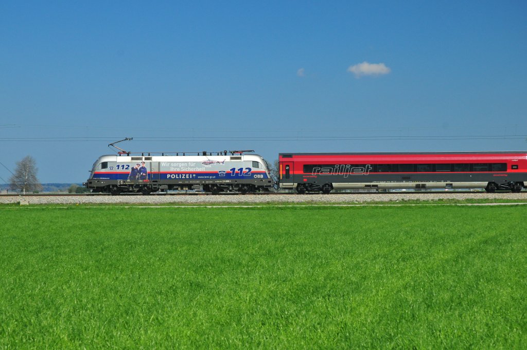 Der Polizei-Taurus 1116 250 vor einem Railjet auf der Strecke München-Salzburg bei Übersee am Chiemsee am 07.04.13.