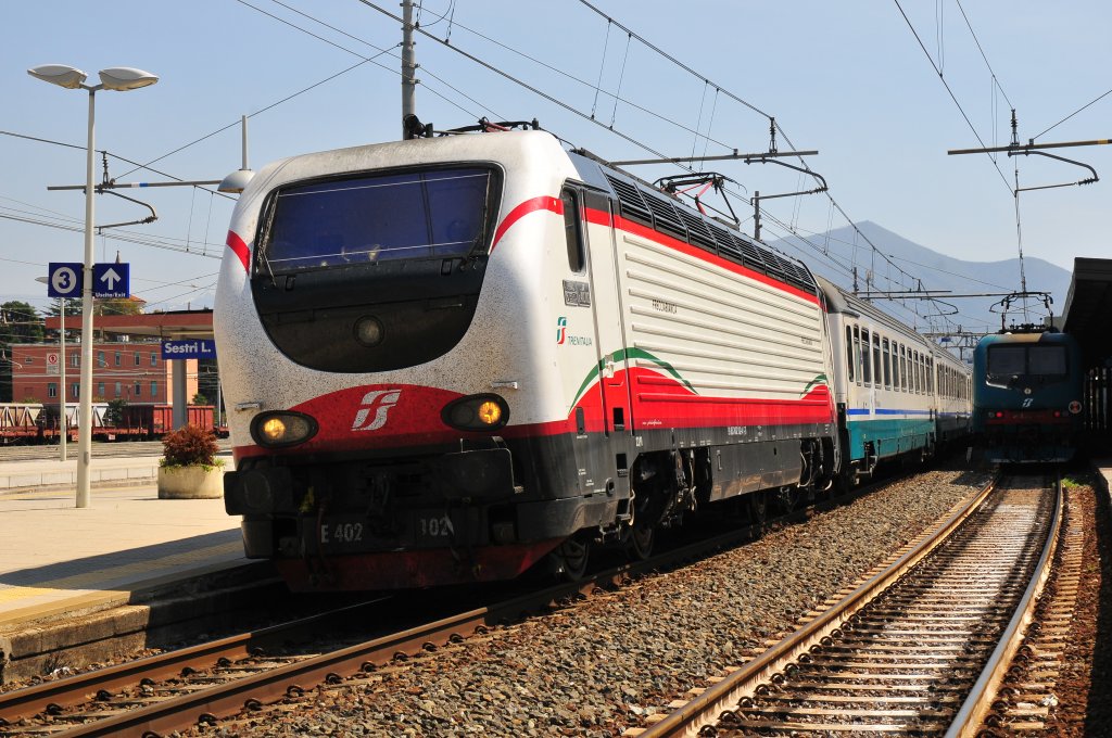 Die E.402102,eine Elektrolokomotive der italienischen Staatsbahnen Ferrovie dello Stato (FS) im Bahnhof von Sestre Levante am 18.04.13.