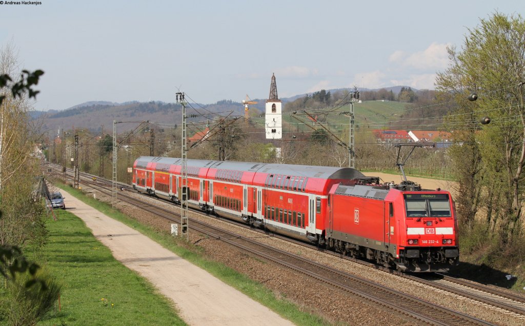 RE 5338 (Basel SBB-Offenburg) am 25.04.2013 bei Kollmarsreute. Schublok war eine BR 146 mit Werbung "Baden-Württemberg erfahren".