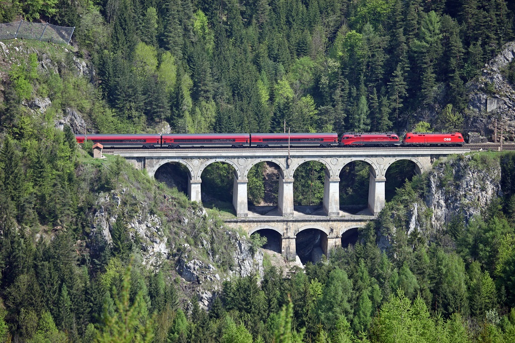 Ein doppelte Railjetgarnitur (RJ731) ist am 9.05.2013 auf der Bergfahrt über den Adlitzgrabenviadukt unterwegs.