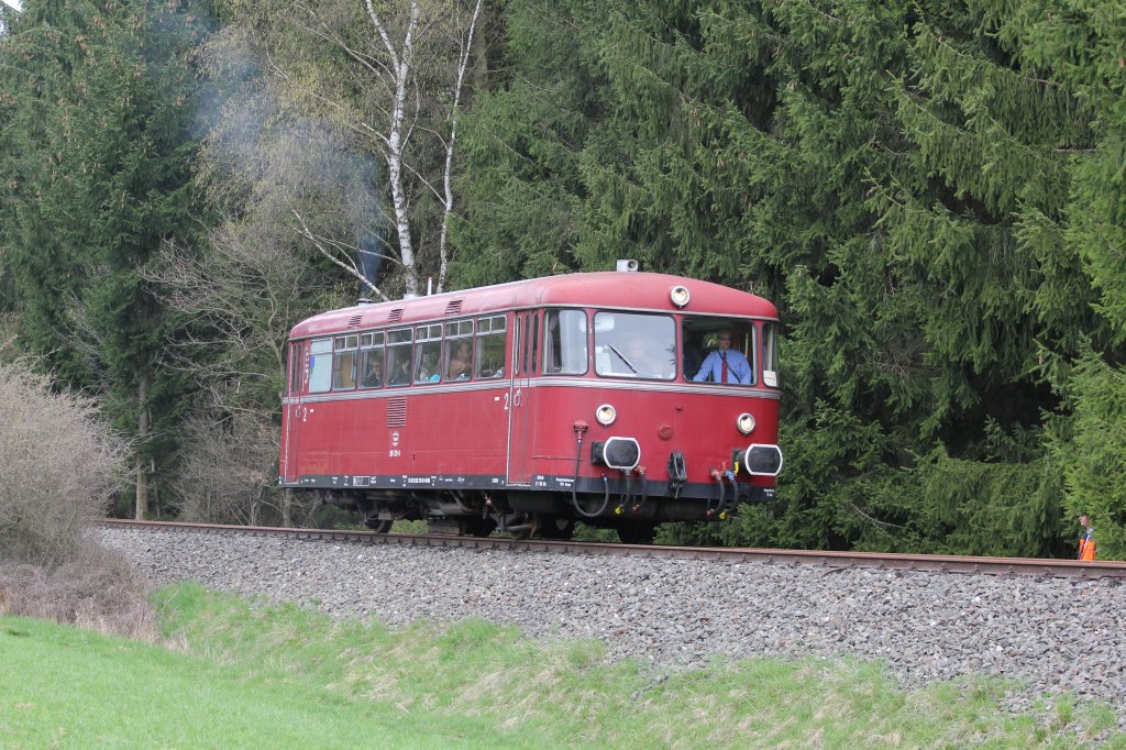 Unterwegs auf der Almetalbahn zwischen Büren und Alme mit dem VT98 in gemütlicher Geschwindigkeit am 1.Mai 2013. Danke an das Zugpersonal, für die Scheinanfahrt.