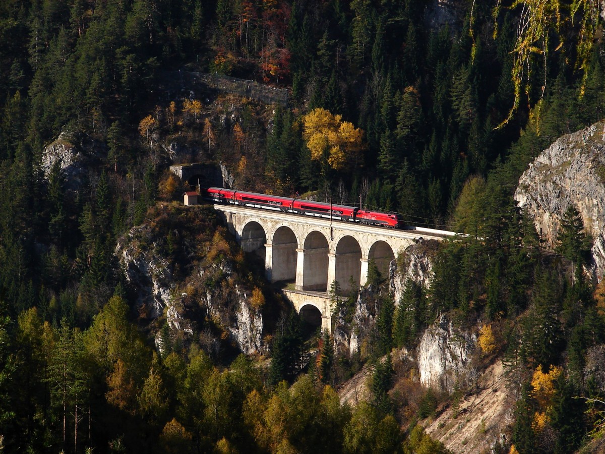 Railjet nach Wien Meidling kommt aus dem Polleroswand-Tunnel, und überquert durch das Krausel-Klause Viadukt. 22.10.2013.