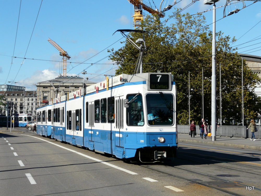 VBZ - Tram Be 4/8 2111 unterwegs auf der Linie 7 in Zürich am 17.10.2013