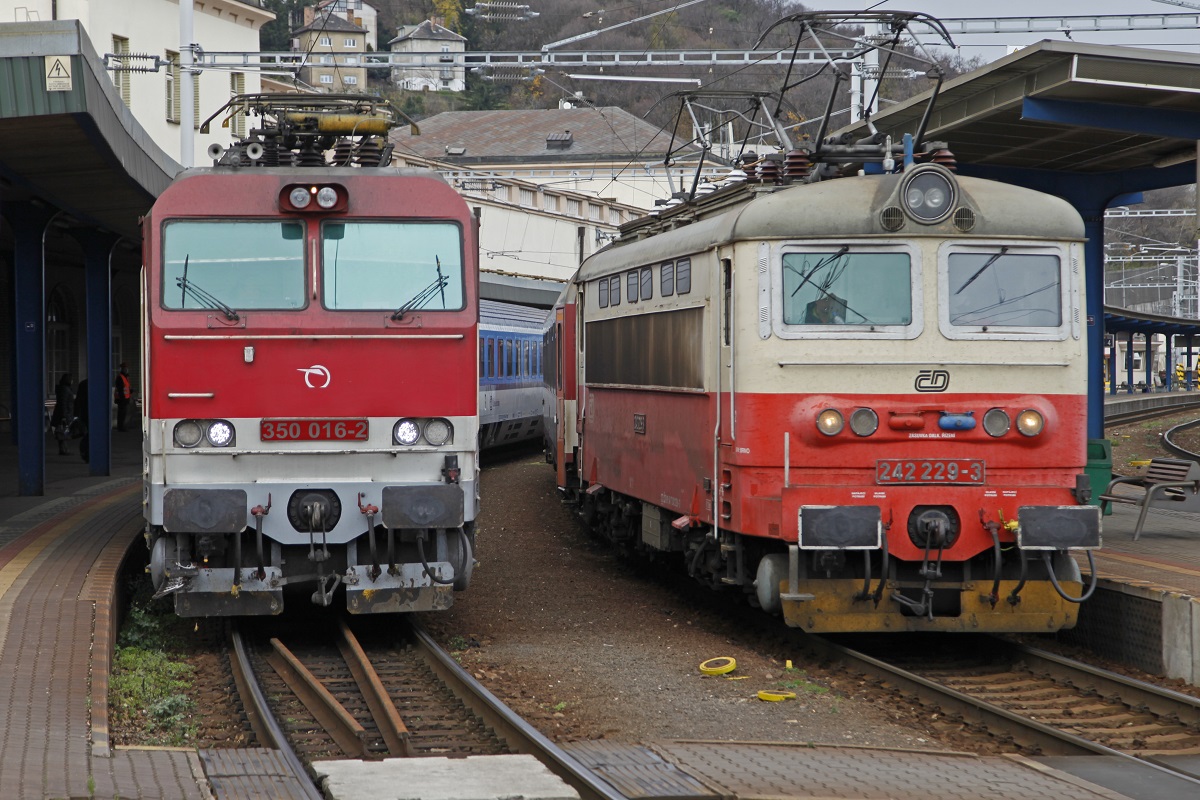 Kopf an Kopf stehen 350 016 und 242 229 in Bratislava Hlavna Stanica am 25.11.2013.