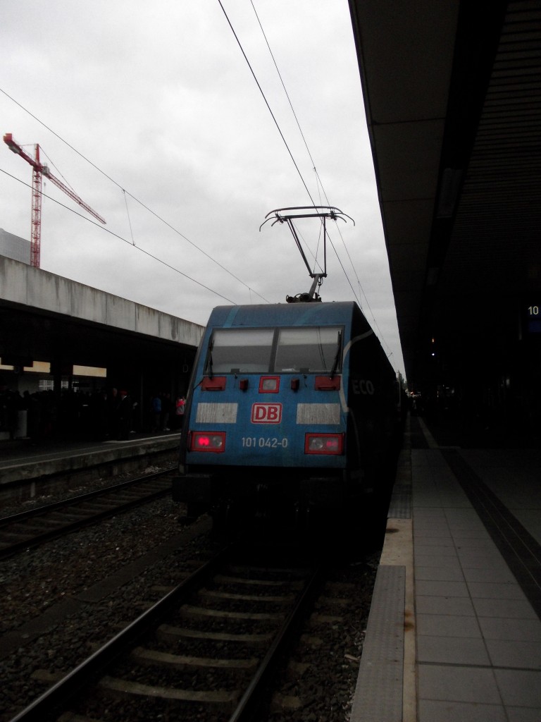 101 115-4 bespannte den EC 9 am 02.11.2013 (Hamburg-Altona - Chur), als sie den Bahnhof von Emmendingen gen Freiburg durchfuhr.