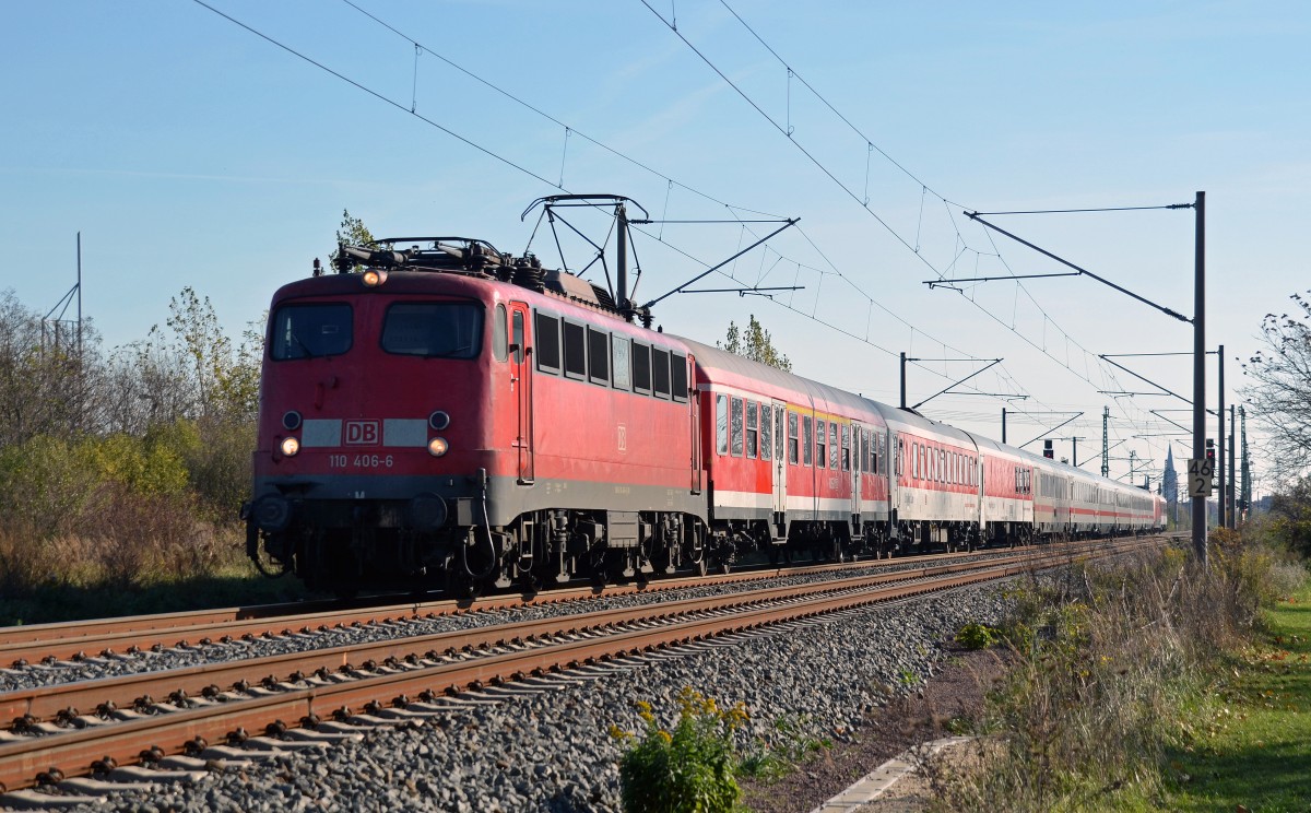 Der PbZ 2466 Leipzig - Berlin wurde am 31.10.13 mit 110 406 bespannt. Mit 101 008 im Zugverband durchfährt der Schadwagenzug Greppin Richtung Dessau.