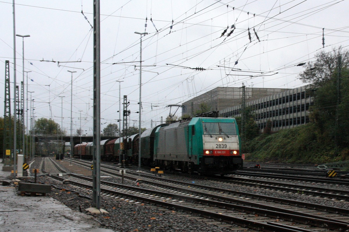 Die Cobra 2839 kommt mit einem langen gemischten Güterzug aus Antwerpen-Noord(B) nach Köln-Gremberg und fährt in Aachen-West bei Regenwetter am Nachtmittag vom 2.11.2013.