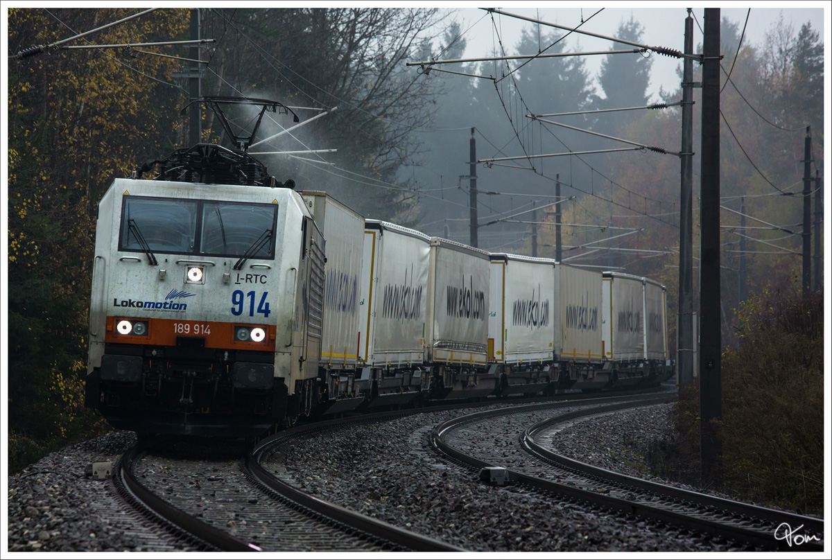 Im strömenden Regen, zieht 189 914 den Ekol 43552 von Triest nach Ostrava.