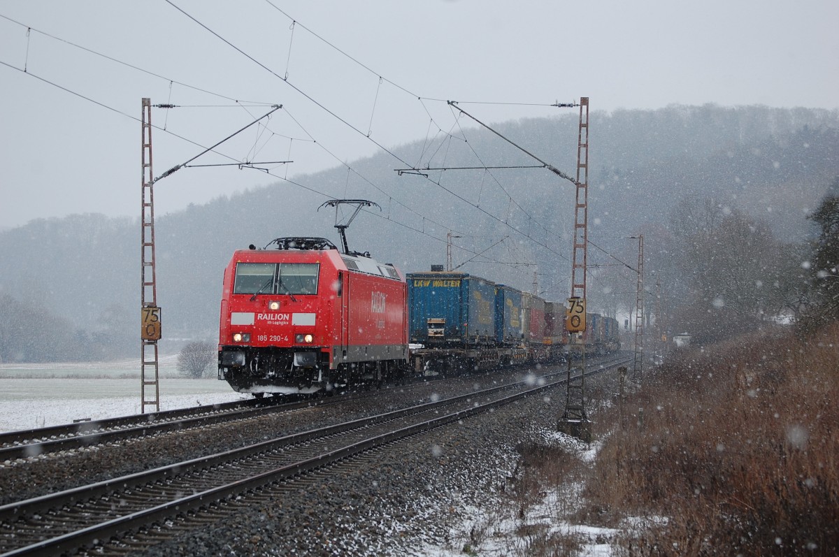 185 290-4 im leichten Schneegestöber, mit einem KLV am 09.02.2013 bei Einbeck-Salzderhelden
