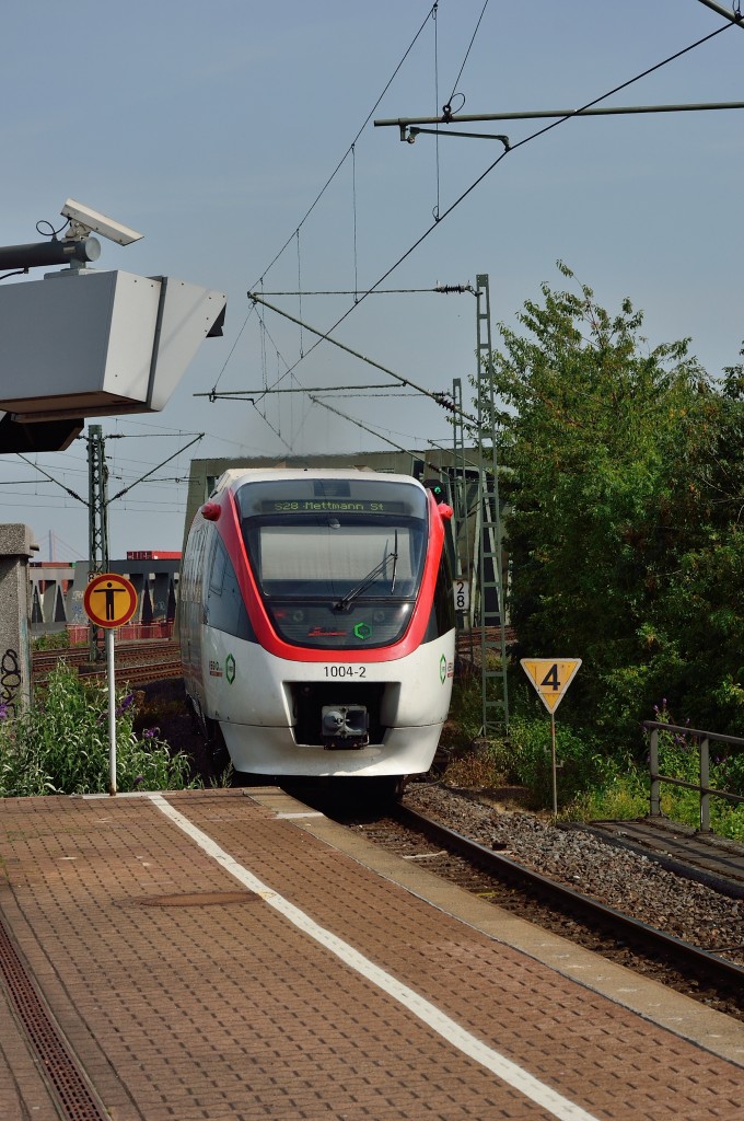 Nachschuß auf eine S28 nach Mettmann an deren Ende ist der VT 1004-2 zu sehen. 27.7.2013 Neuss am Kaiser