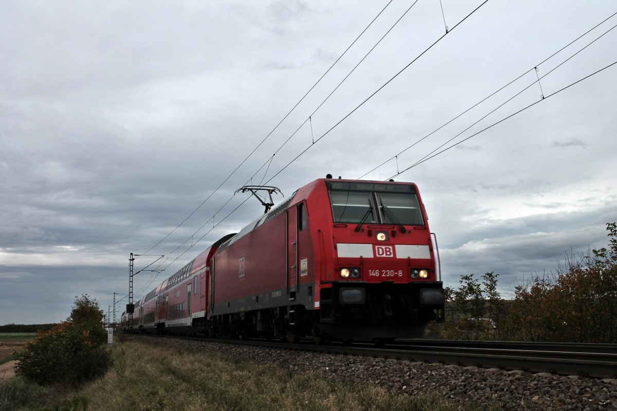 Am 08.11.2013 bespannte die Freiburger 146 230-8 den RE 5341 (Offenburg - Basel SBB) als sie bei Hügelheim nördlich von Müllheim (Baden) in den gleichnamigen Bahnhof einfährt.