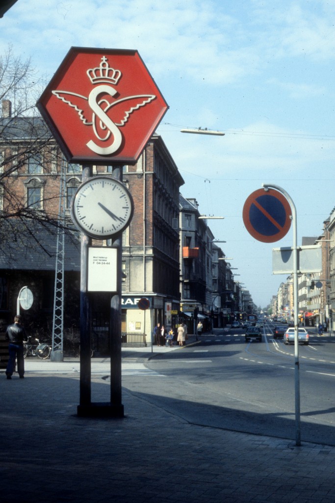 DSB S-Bahn Kopenhagen: Das S-Schild vor dem S-Bf Frederiksberg (Falkoner Allé) im Juni 1978.