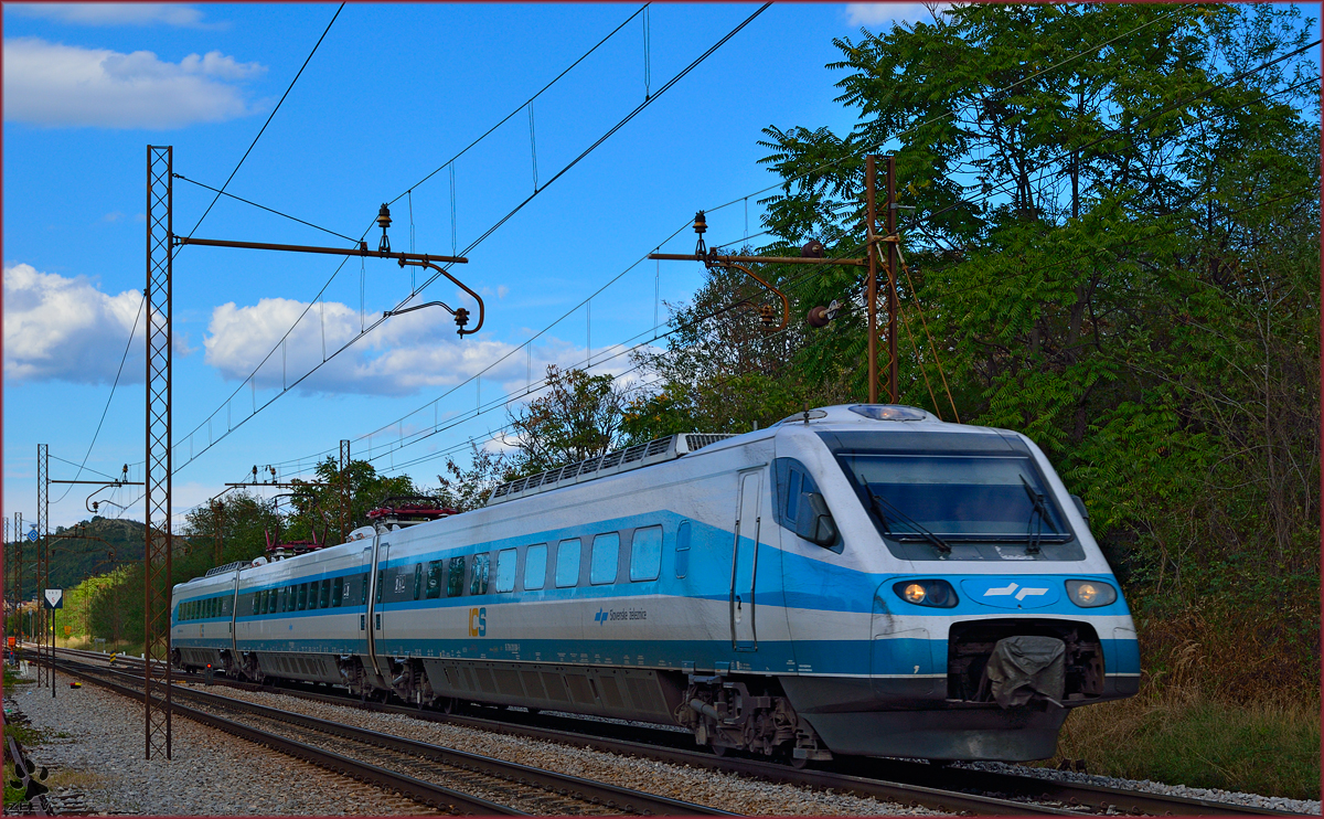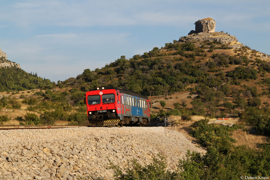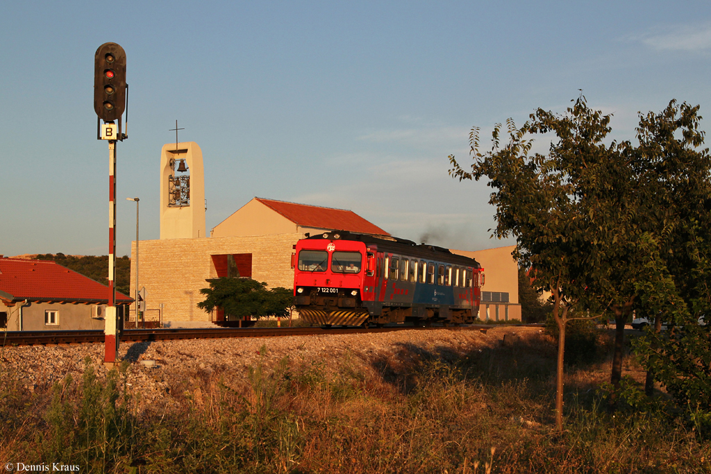 Als Abendzug auf der Strecke Knin – Zadar wurde am 30.08.2013 7122 001 eingesetzt. Im letzten Licht des Tages wurde der Triebzug bei Skabrnje abgelichtet.