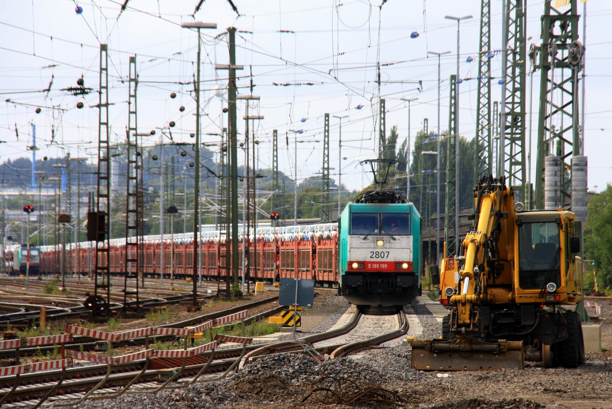 Die Cobra 2807 fährt mit einem langen Fiat-Autozug aus Polen nach Belgien. Und ein Bagger steht in Aachen-West.
