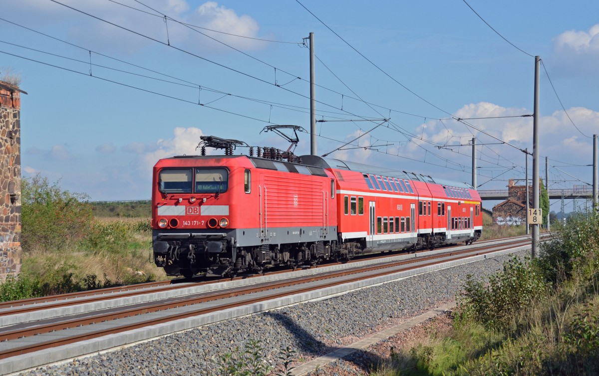Mit einer aus nur zwei Wagen bestehenden RB von Lutherstadt Wittenberg nach Halle(S) erreicht 143 171 am 28.09.13 Brehna.