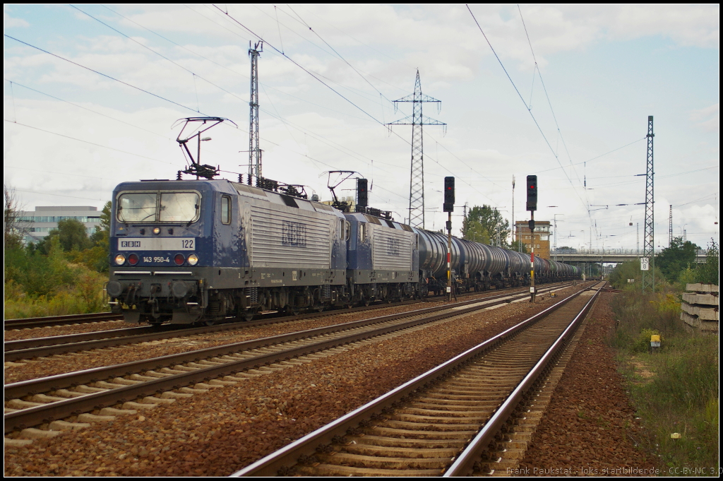 RBH 122 / 143 950 mit der Schwestermaschine RBH 123 und einem Kesselwagenzug am 28.09.2013 in Berlin Schönefeld Flughafen