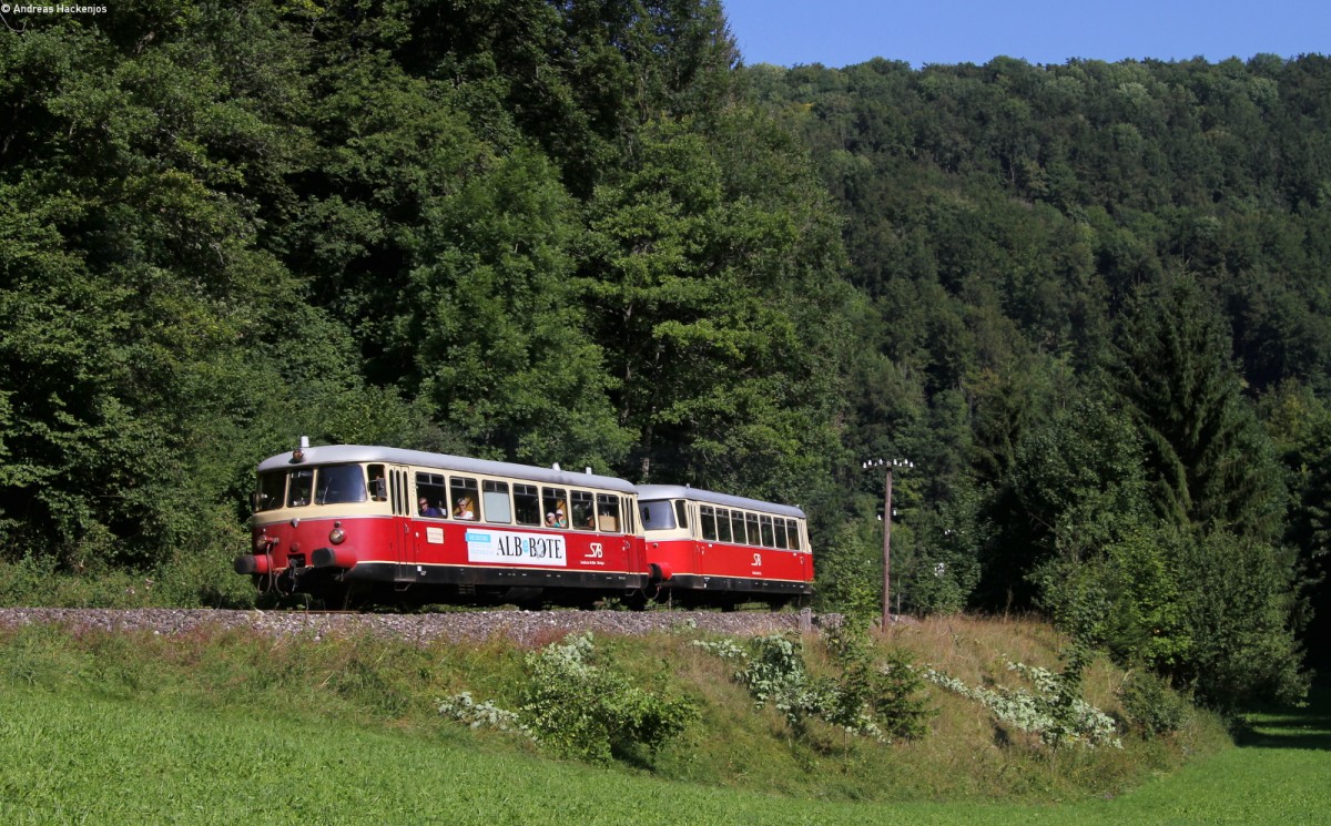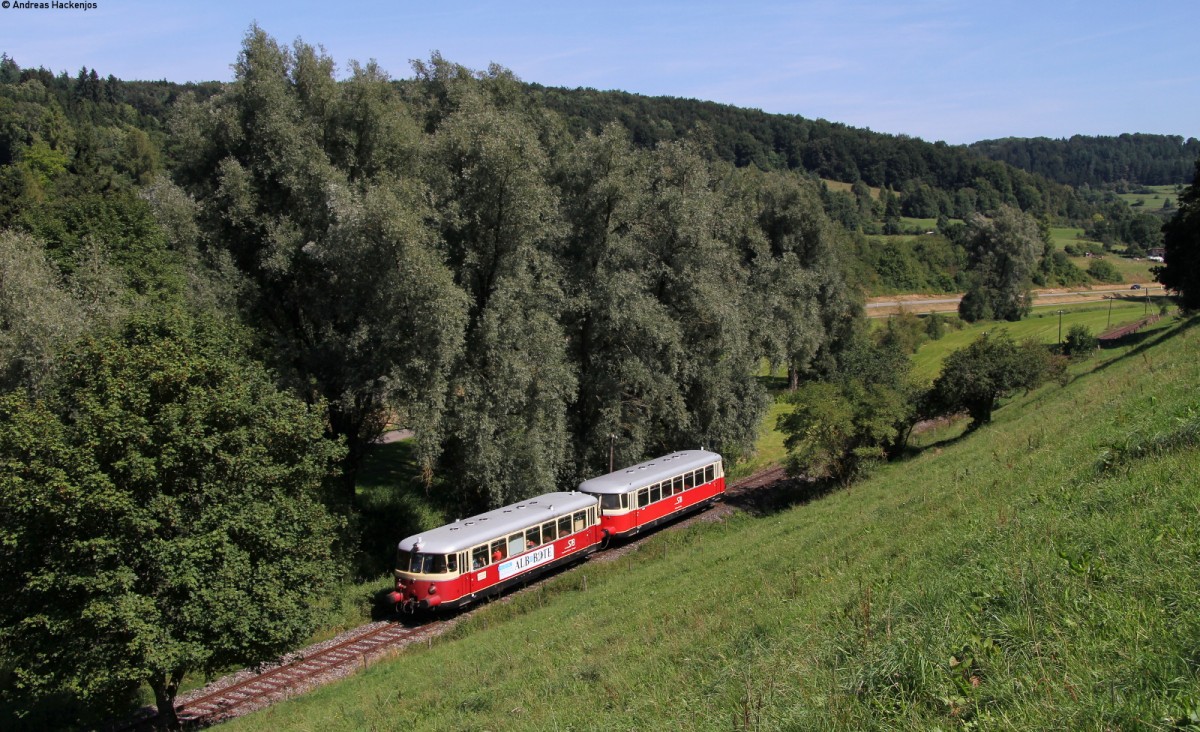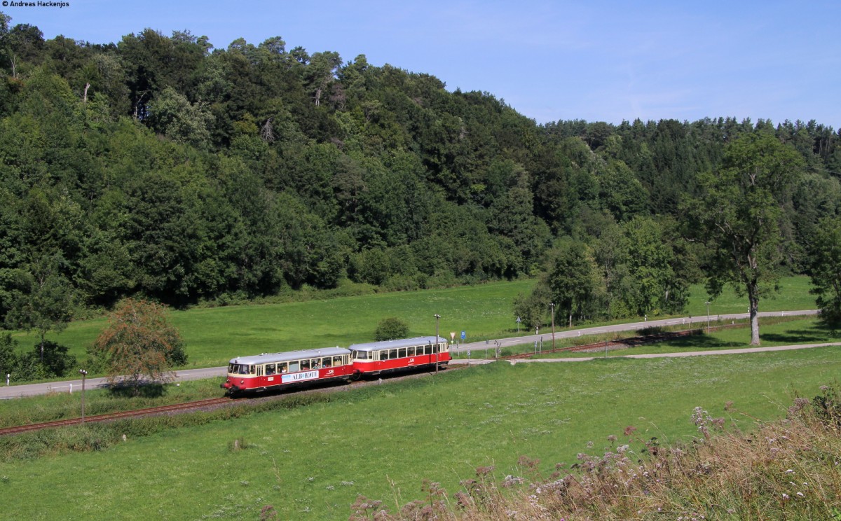 VT 8 und VS 14 der SAB als SAB-Sommerferien-Express Schelklingen-Offenhausen) bei Sondernach 21.8.13