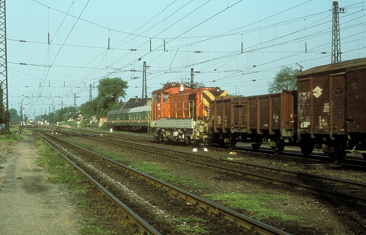 Im Juli 1985 durchfährt 217 016-5 mit einem Güterzug den Bahnhof Hartmannshof