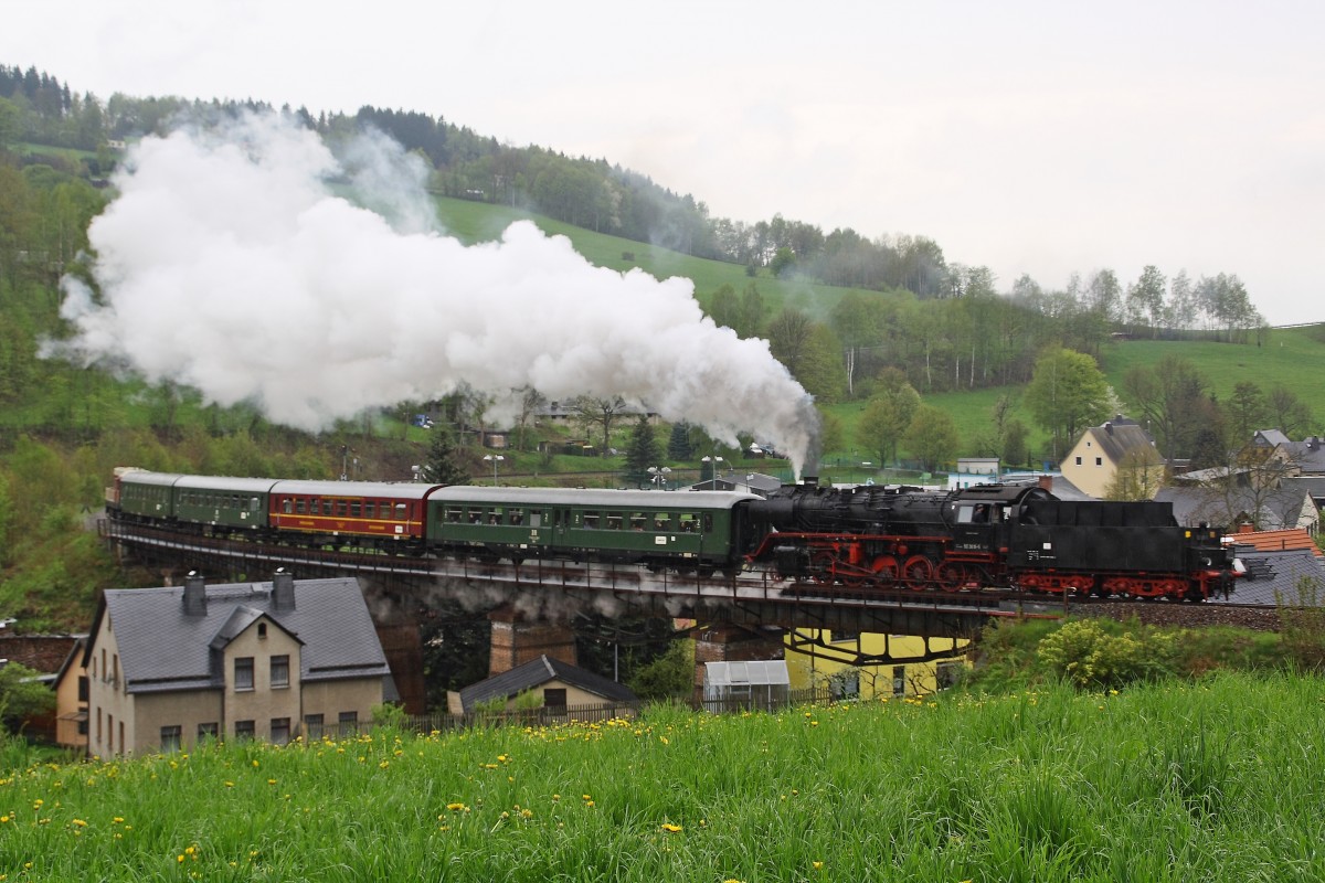 50 3616-5 passiert am 11.05.2013 die Schwimbadbrücke in Markersbach, die Schublok ist 107 018-4.