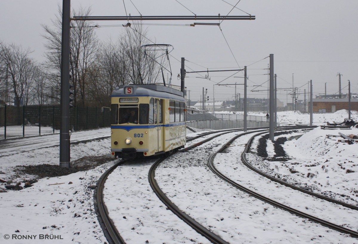 Am Tag der Eröffnung des neuen Streckenabschnitts von der Straße der Nationen zum Hauptbahnhof, befährt der historische Triebwagen 802 der Chemnitzer Straßenbahnfreunde am 16.02.2013, kommend vom Hbf..