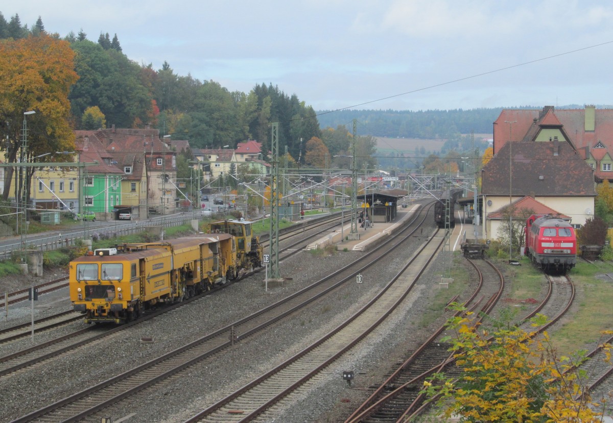 Eine Stopfmaschine der Firma PORR-ALPINE AustriaRail durchfährt am 13. Oktober 2013 den Bahnhof Kronach in Richtung Lichtenfels.