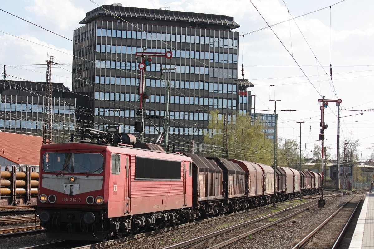 155 214 am 18.4.13 mit einem Stahlzug von Gremberg nach Wanne bei der Durchfahrt durch Düsseldorf-Rath.