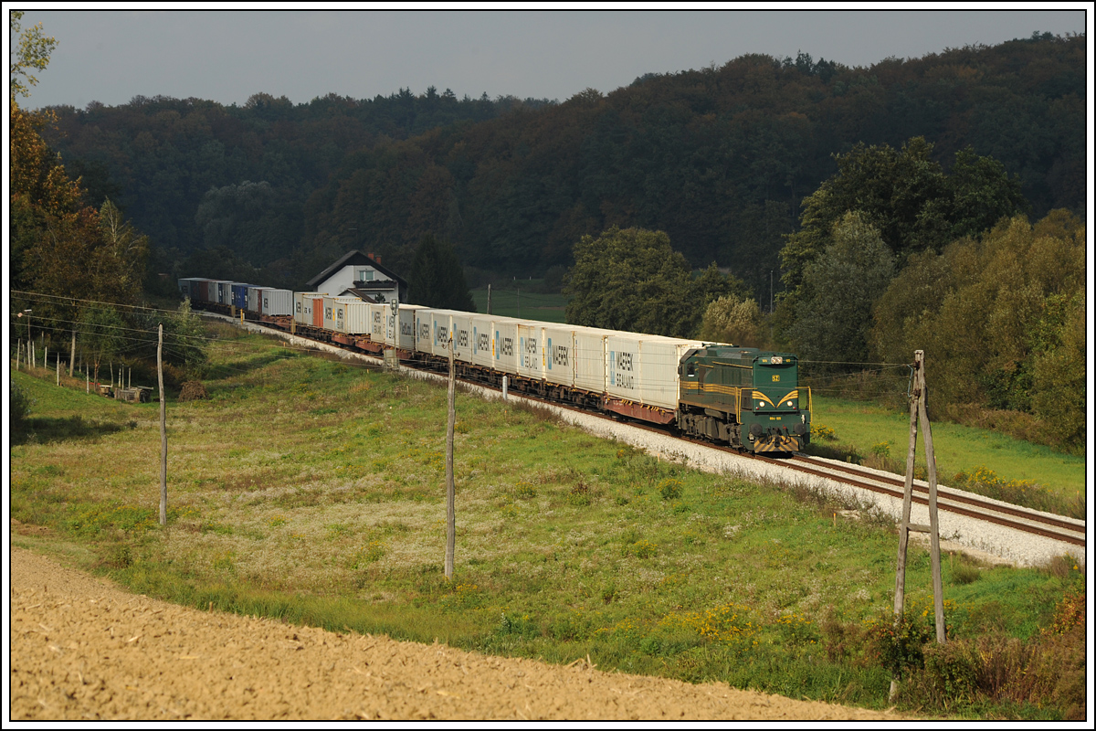 Absolutes Wolkenlotto hatten wir bei 664-105 mit ihrem Metrans Containerzug von Hodo¨ nach Pragersko kurz vor dem Bahnhof Ivanjkovci am 10.10.2013. Kurz vor und kurz nach der Aufnahme war die Fotostelle im Schatten einer Wolke. (Televersion)