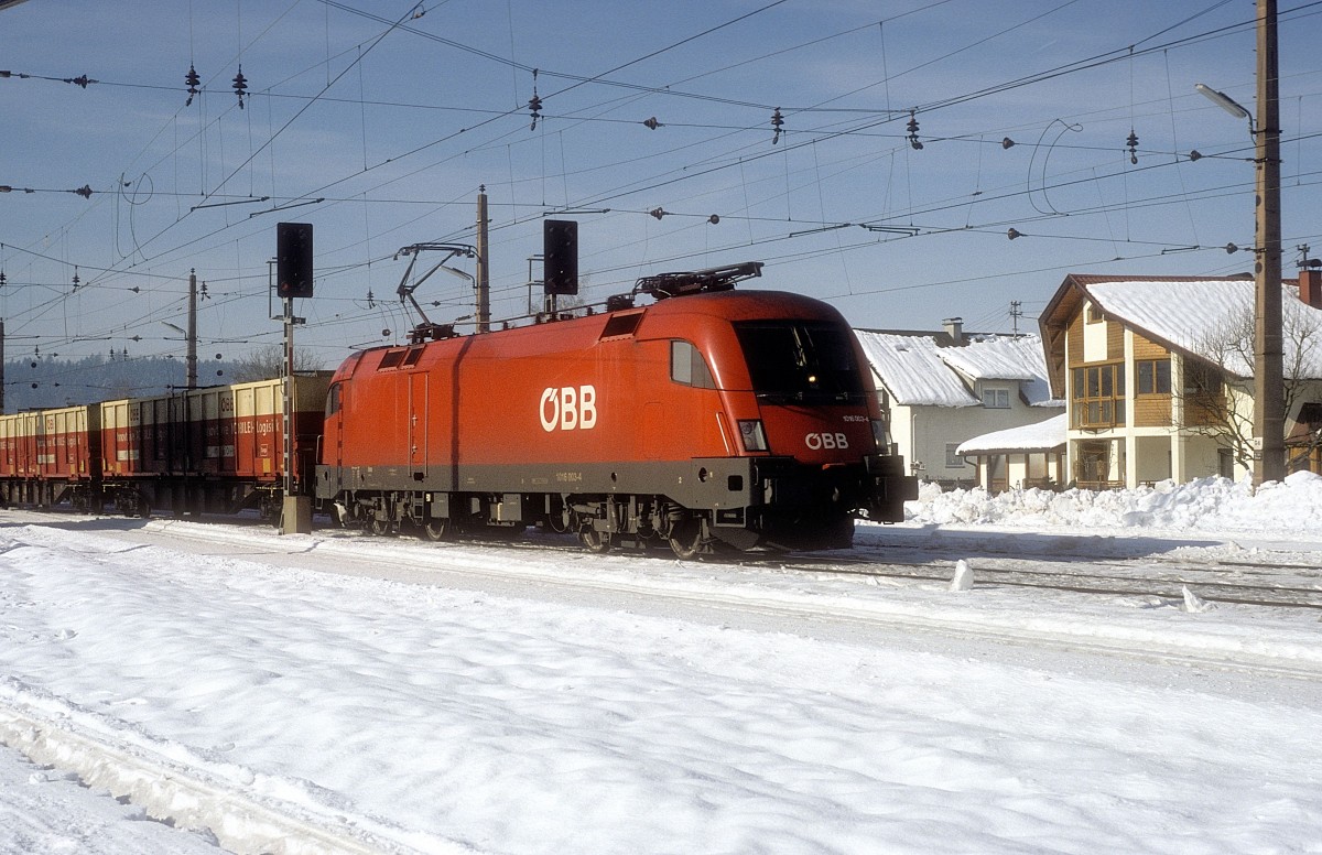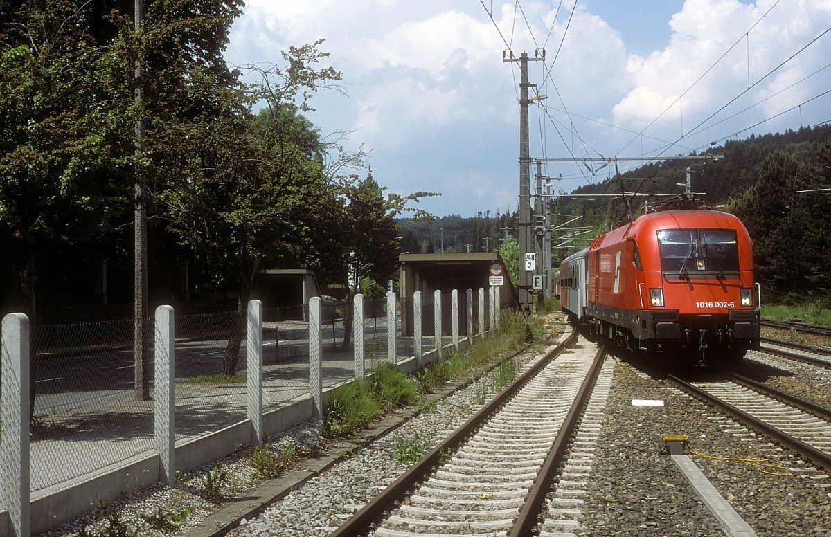 Im Juni 2000 fährt 1110 004-7 mit einem Güterzug durch den Bahnhof St. Anton am Arlberg. Knapp 3 Monate später wurde der neue Bahnhof in Betrieb genommen und die alte Streckenführung stillgelegt. Der heutige Zustand ist auf dem unteren Bild, das im August 2010 entstand, sichtbar.