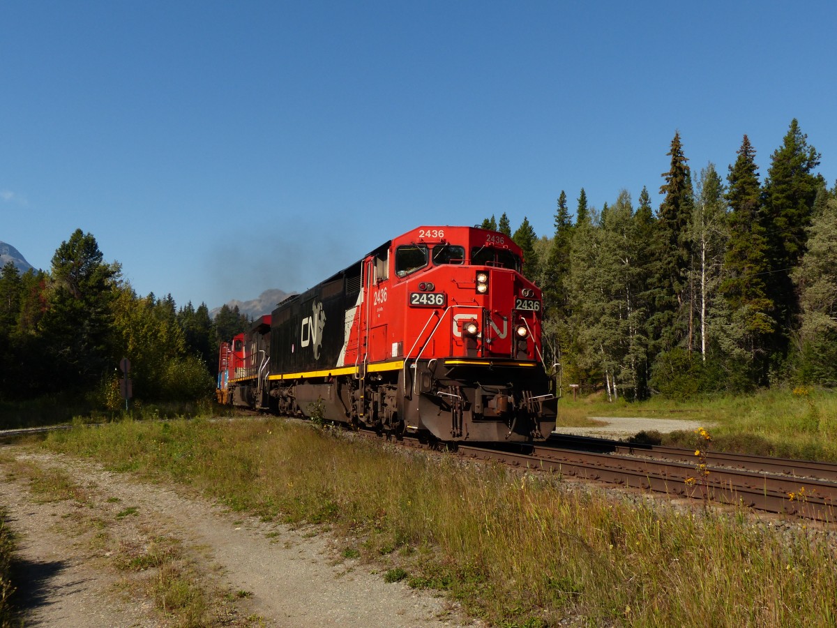 Canadian National 9841 und 6793 ziehen einen Güterzug am 03.09.2013 bei Jasper in Richtung Westen.