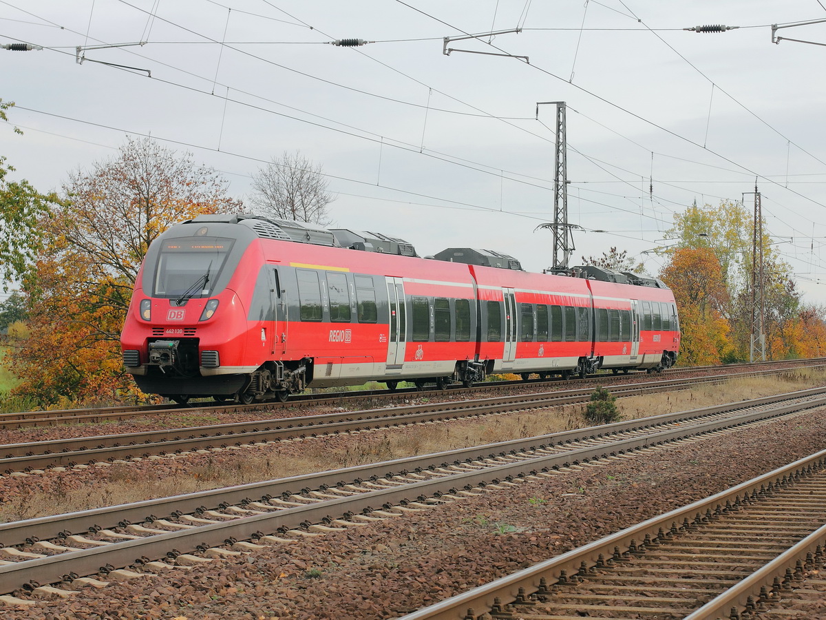 442 130 mit 442 630 als RB 22 (RB 28817) von Berlin Schönefeld Flughafen kommend kurz vor der Einfahrt in den Bahnhof Saarmund zur Weiterfahrt nach Potsdam Hauptbahnhof am 20. Oktober 2013.