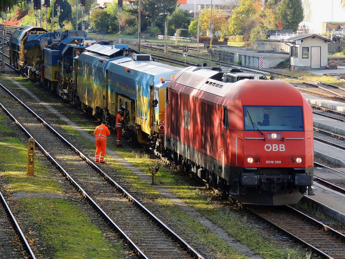 2016 069-3 holt am Bhf. Ried den DYNAMIC-Stopfexpress ab, um diesen dann Richtung Wels zu befördern; 131017