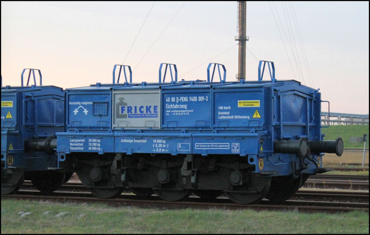 Eichbeiwagen der Firma Fricke mit Prüfgewichte für Gleiswaagen, abgestellt auf den Gleisen der Tankfarm Hestya. Wilhelmshaven 22/01/2013