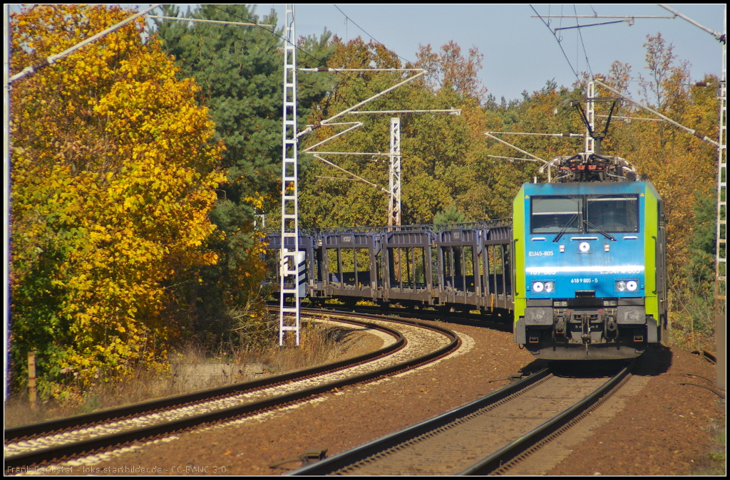 PKPC EU45-805 / 189 805 mit leeren Autotransportwagen am 22.10.2013 am Bahnübergang Berlin Wuhlheide