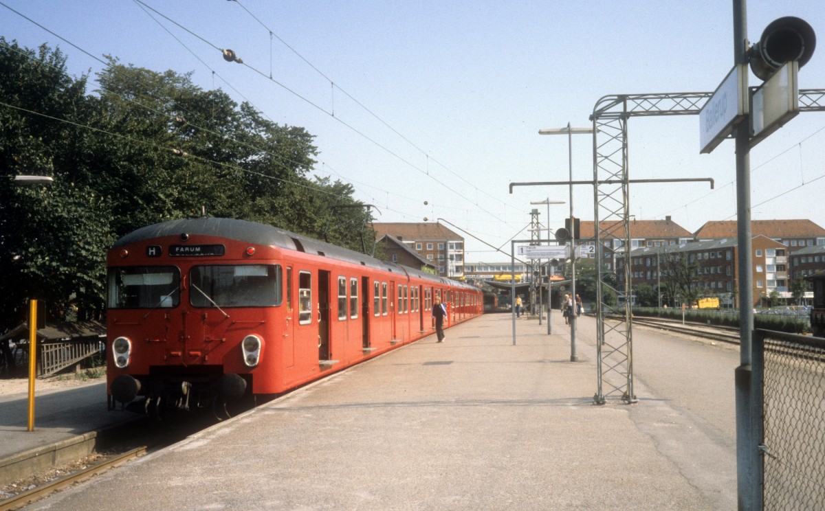 DSB S-Bahn Kopenhagen am 24. August 1979: Ein Zug der Linie H hält im Bahnhof Ballerup.