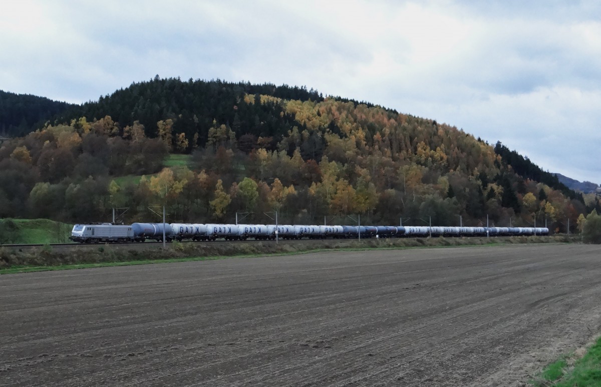 Teleaufnahme der 1116 138 "Heeressport", welche mit dem Russenzug 13017 (Moskau - Nizza) durch das herbstliche Murtal braust. St. Lorenzen 18.10.2013
