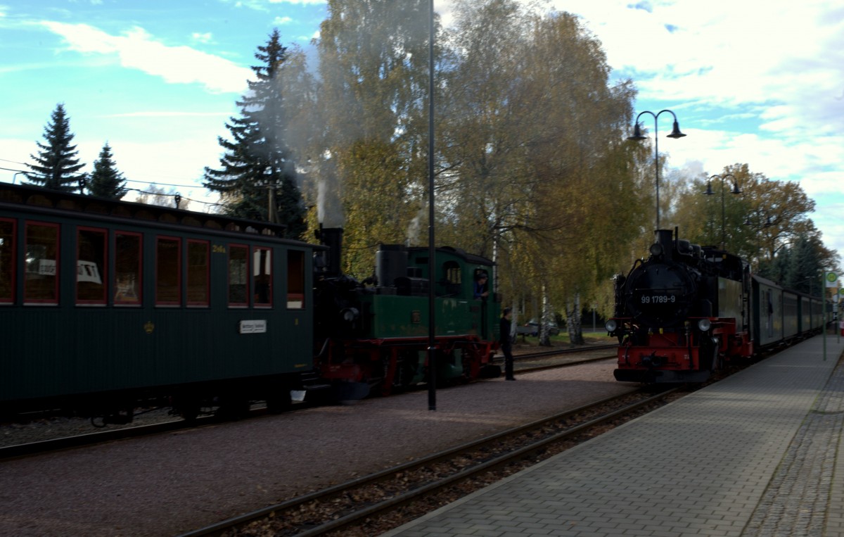 Doppelausfahrt mit Volldampf der HSB am 25.10.2013. Lok 99 7245-6 (links) und 99 5906-5 der Selketalbahn (rechts) fahren zusammen aus dem Bahnhof Eisfelder Talmühle.