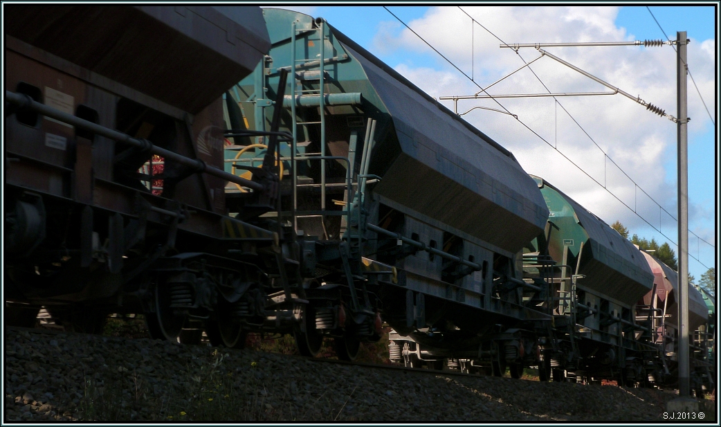 Die Zahl der Kohlenzüge erhöht sich in den Herbst und Wintermonaten. Die Sonneneinstrahlung nimmt ab und so müssen die Steinkohlekraftwerke an der Saar wieder verstärkt ans Netz. Bedient werden noch die Kraftwerke Weiher (Göttelborn/Quierschied), das Kraftwerk Bexbach bei Neunkirchen, das Kraftwerk Fenne bei Völklingen und seit einigen Wochen wurde das Kraftwerk Ensdorf wieder auf Eisenbahnbelieferung ( statt Schiff ) umgestellt. Außer den Kraftwerken braucht auch die Zentralkokerei der Dillinger Hütte noch das "Schwarze Gold". 189 206 (ES 64 F4-206) und 189 094 ( ES 64 F4-994)(wohl im Auftrag von NIAG)durchfahren den ehemaligen Bahnhof Saarhölzbach in Richtung Saarbrücken. In Saarhölzbach liegen statt der ehemaligen 6 noch 2 1/2 Gleise. 25.10.2013 - Bahnstrecke 3230 Saarbrücken - Karthaus