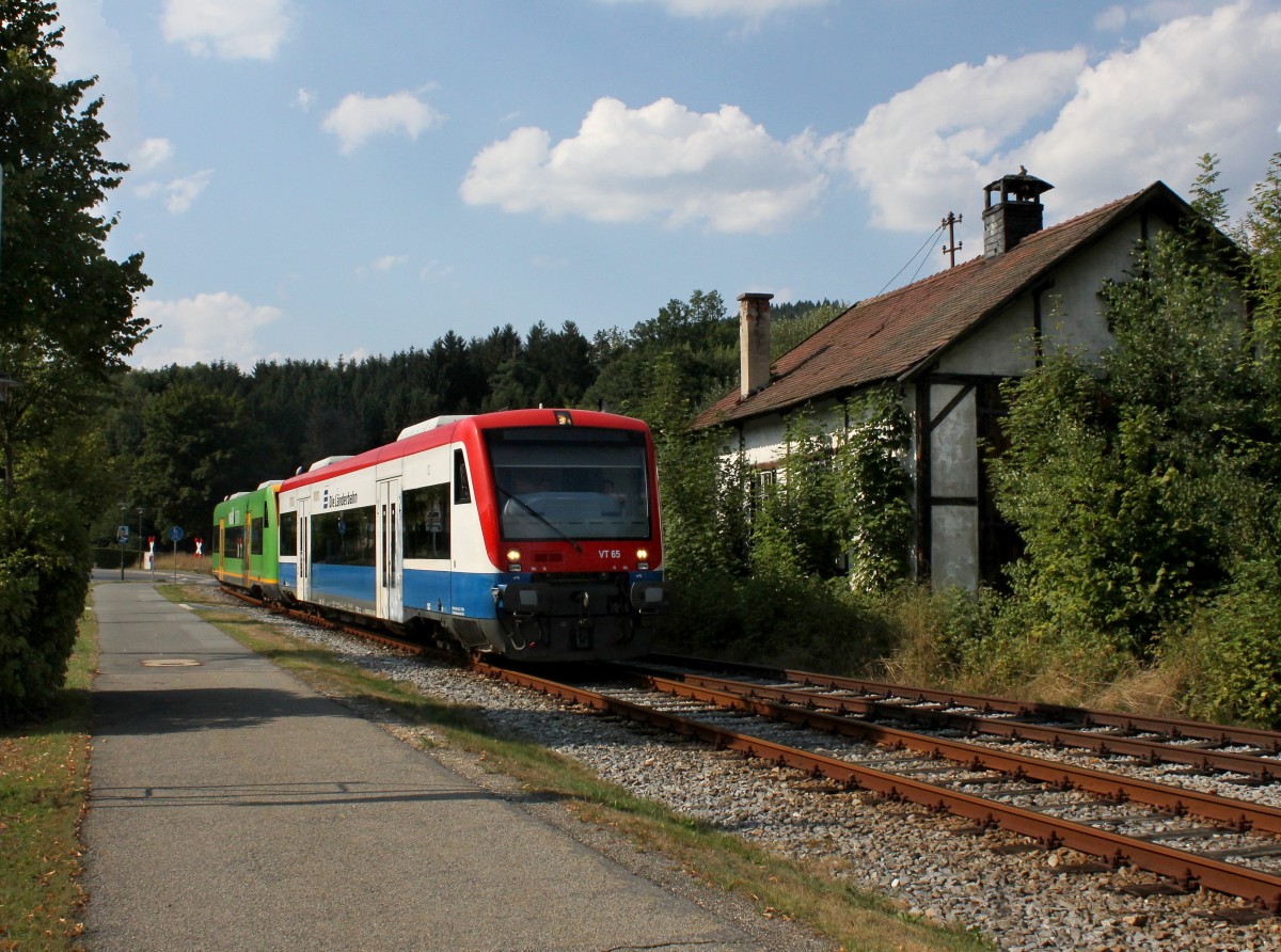 Der VT 65 und der VT 27 bei einer Überführungsfahrt nach Zwiesel am 17.08.2013 bei Durchfahrt in Teisnach.