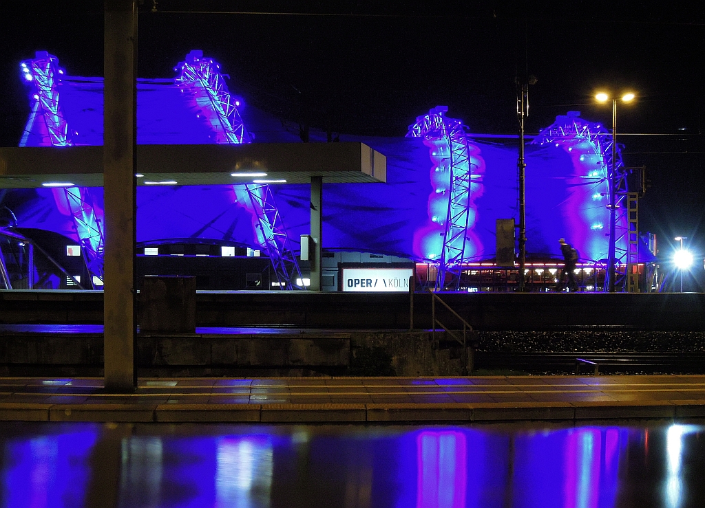Impressionen Köln Hbf.: effektvolle Beleuchtung durch den  Musical Dome  und seine Reflektionen auf dem regennassen Schaltkasten am Gleis 5. 27.10.2013
