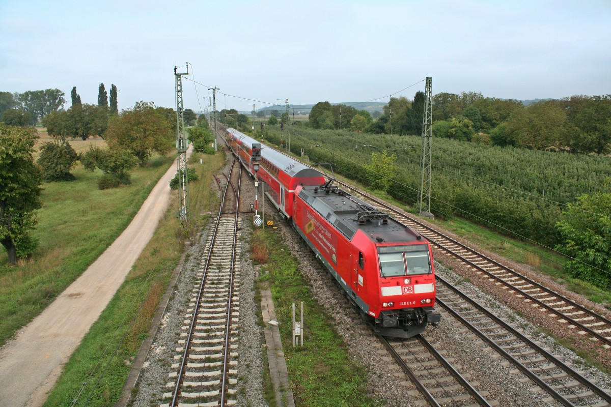 146 111-0 mit einem RE von Offenburg nach Basel am Mittag des 28.09.13 bei der Einfahrt in Müllheim (Baden).