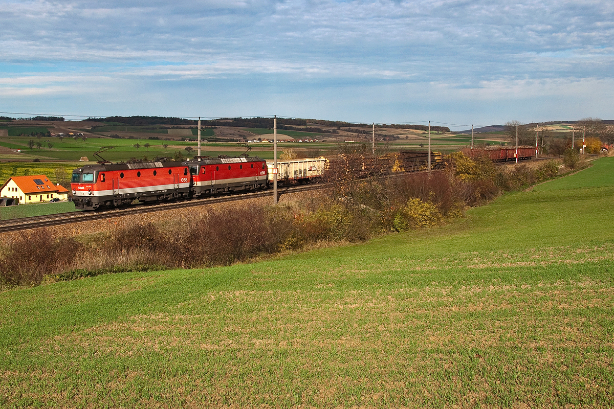 2 x 1144 mit einem kurzen Güterzug, unterwegs bei Neulengbach Richtung Westen, aufgenommen am 28.10.2013.