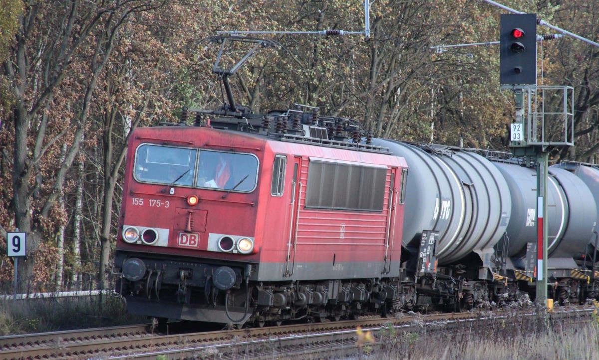 30.10.2013 Zepernick. 155 175 legt sich mit Kesselzug Höhe Blocksignal 92 03 der Gegenrichtung in die Kurve.