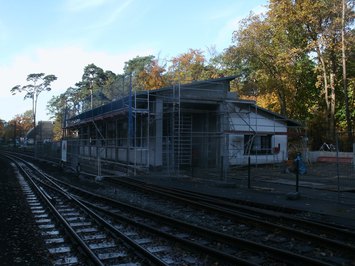 Statt Abriß wurde der Lokschuppen in Göhren neu gebaut.Wie sein Vorgänger wird der Lokschuppen auch nur eingleisig.Aufgenommen am 26.Oktober 2013.