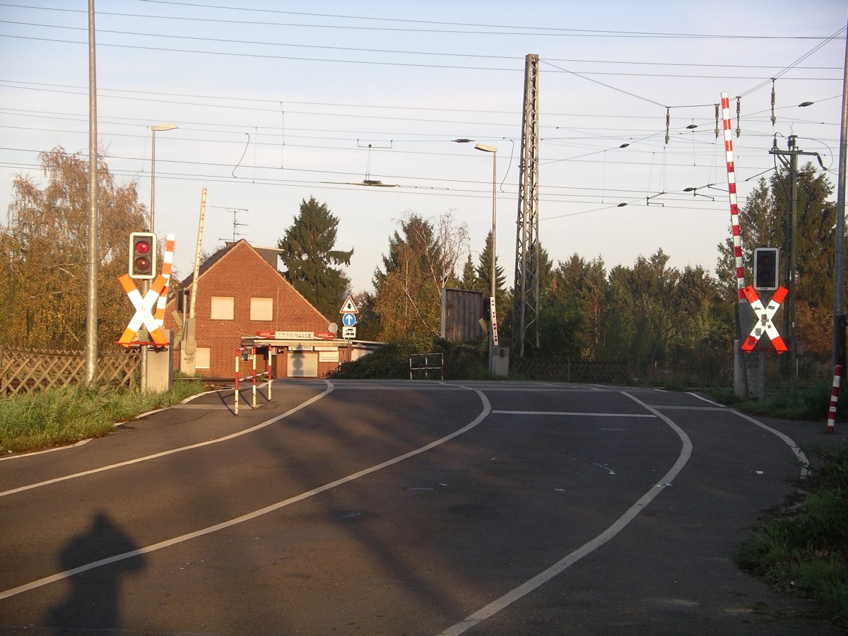 Bahnübergang Blumenstraße am Morgen des 31.10.2013. Sonne steht im Rücken.