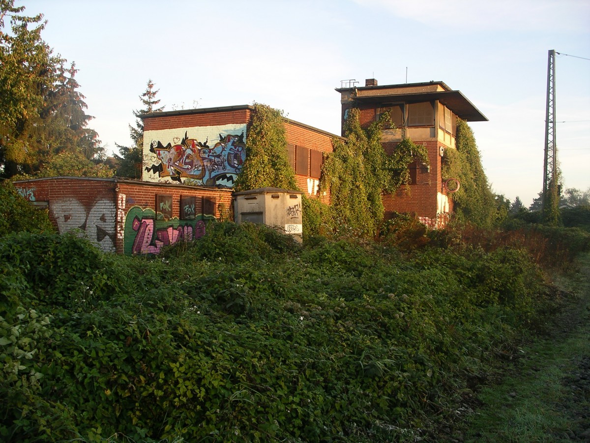 Das ehemalige Stellwerk am Bahnübergang Blumenstraße. Der Bahnübergang ist nicht auf dem Bild zu sehen. Das Stellwerk ist Wetter ausgesetzt und in marodem Zustand. 31.10.2013