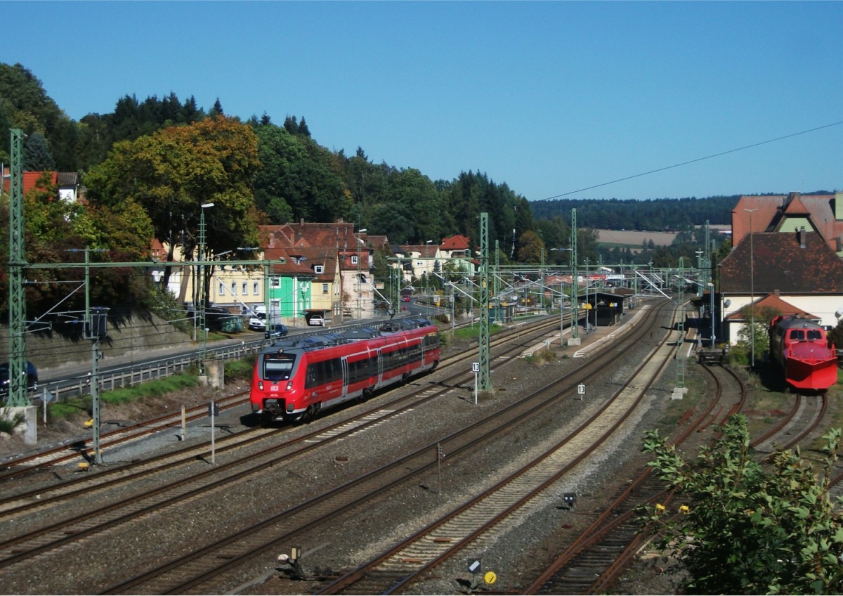 Zugkreuzung in Hungen am 25.9.13: HLB 121 (links) fährt als RB 24465 nach Nidda und 509 106 als RB 24466 nach Gießen.