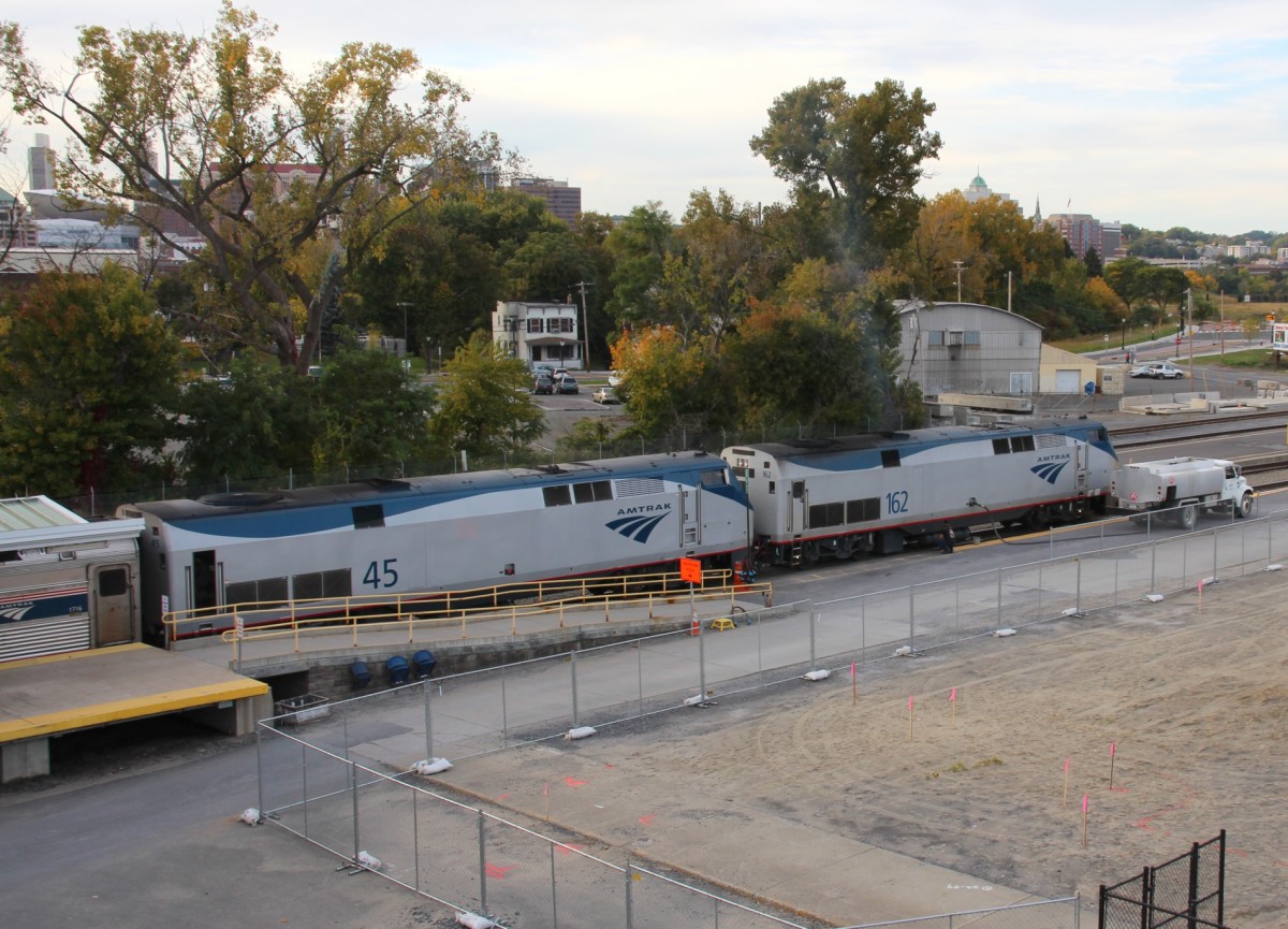 3.10.2013 Albany-Rensselaer. Der Lakeshore Ltd aus Boston mit Genesis 45 & 162 ist soeben eingetroffen, wird betankt und rangiert dann vor um mit dem Zugteil aus New York City vereint zu werden.