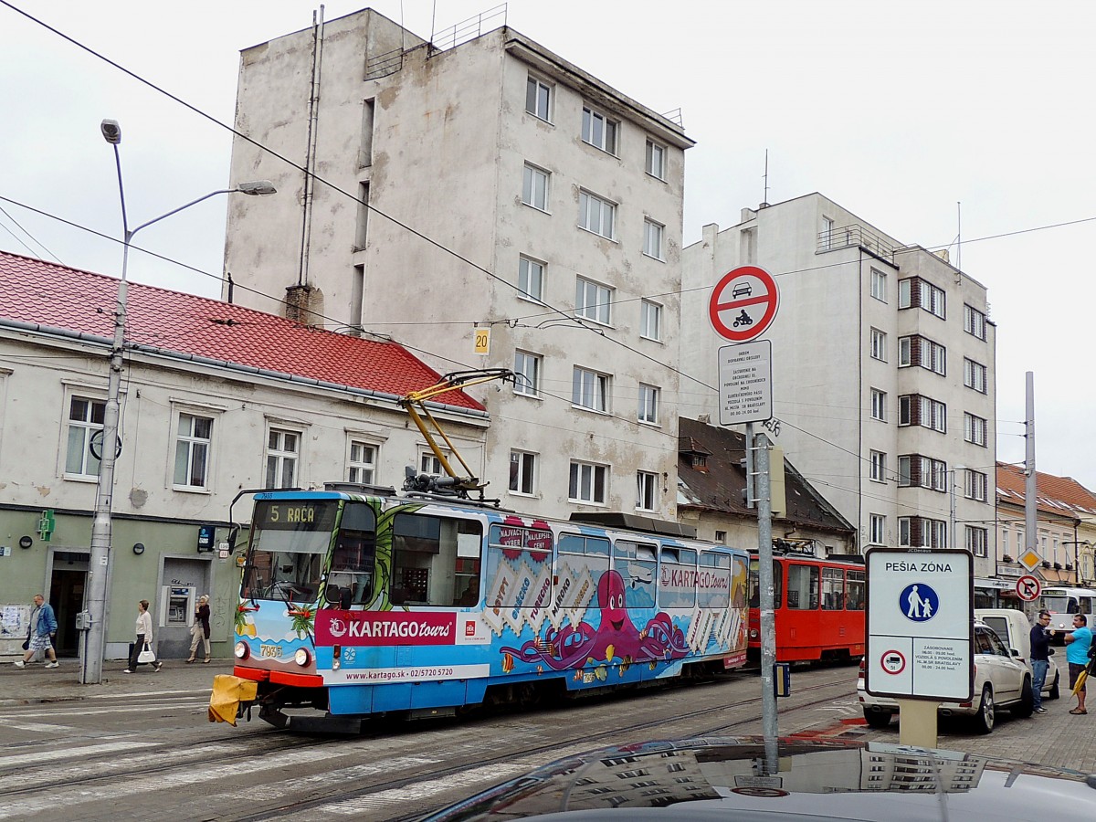 7935 ist als Werbeträger eines Reisebüros zur Endstation Rača-Komisárky der Linie 5 in Bratislava unterwegs; 130828