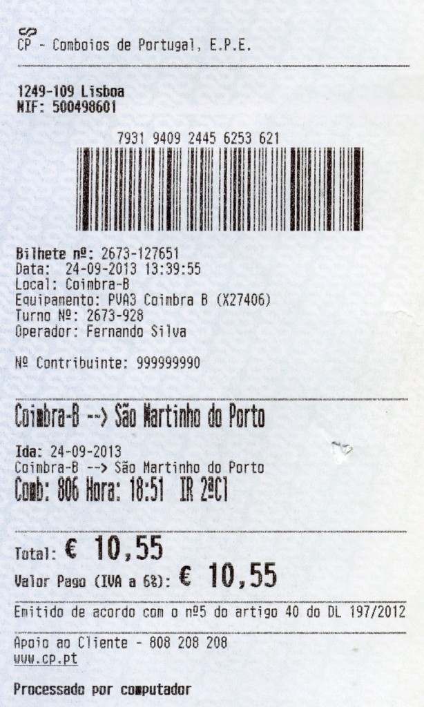 COIMBRA (Distrikt Coimbra), 24.09.2013, Fahrkarte für eine einfache Fahrt von Coimbra nach São Martinho do Porto, gekauft am Schalter -- Fahrkarte eingescannt