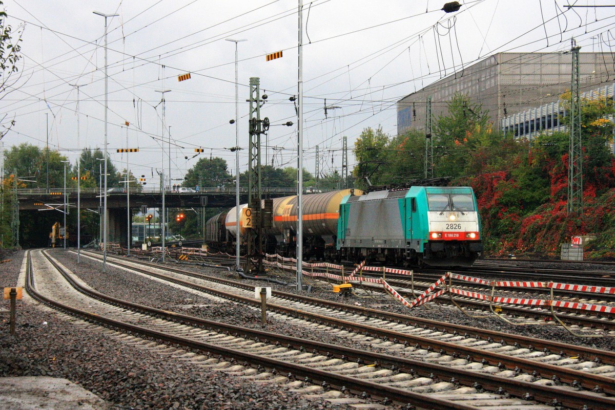 Die Cobra 2826 kommt aus Richtung Köln,Aachen-Hbf mit einem langen gemischten Güterzug aus Köln-Gremberg nach Antwerpen-Noord(B) und fährt in Aachen-West ein bei Regenwolken am Abend vom 9.10.2013.